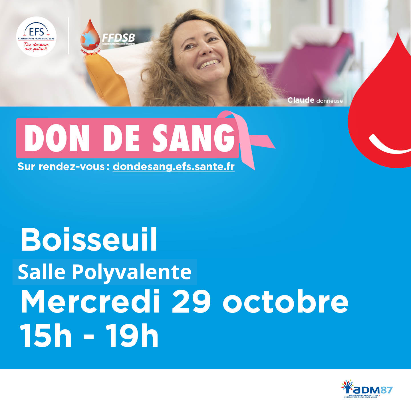Une collecte de sang aura lieu le mercredi 29 octobre entre 15h et 19h à la salle polyvalente de Boisseuil. Prenez rendez-vous sur dondesang.efs.sante.fr (lien cliquable ci-dessous ⬇)