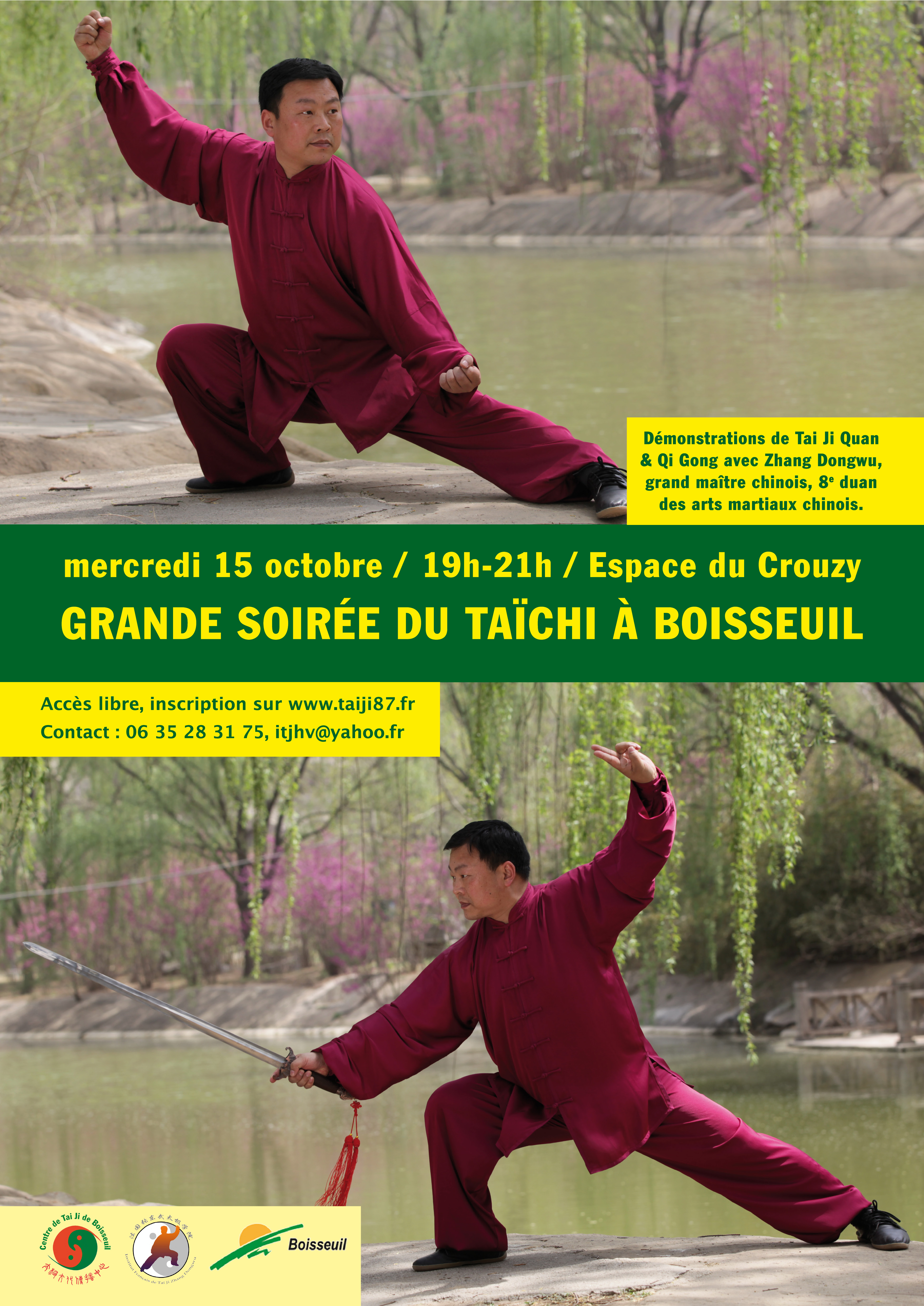 Le Centre de Tai Ji de Boisseuil célèbre ses 10 ans d’existence avec une grande soirée spéciale mercredi 15 octobre, à l’Espace du Crouzy. Un grand maître chinois, Maître Zhang Dongwu, 8e Duan des arts martiaux chinois, “ambassadeur international pour la culture du Tai Ji Quan”, en est l’invité d’honneur. Cette soirée mettra en lumière la beauté de l’art martial et l’art du bien-être par des démonstrations de Qi Gong, de Tai Ji Quan (à mains nues, à l’épée, à l’éventail), et une immersion artistique mêlant calligraphie, musique, photographies et projections vidéo... Un dialogue entre tradition et modernité, entre orient et occident, où chaque mouvement raconte l’équilibre du Yin et du Yang et l’harmonie du corps et de l’esprit. Spectacle pour tout public, Accès libre. Entrée «au chapeau». Places limitées - Inscription préalable au lien ci-dessous