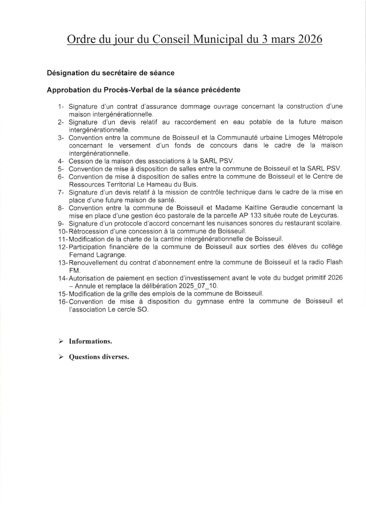 ➡️ Le prochain conseil municipal aura lieu : 📍 en mairie de Boisseuil, salle du conseil, 🗓️ ce mardi 3 mars 2026, 🕚 à 18h. 👉 Vous pouvez suivre le direct du conseil via l’application Boisseuil87.
