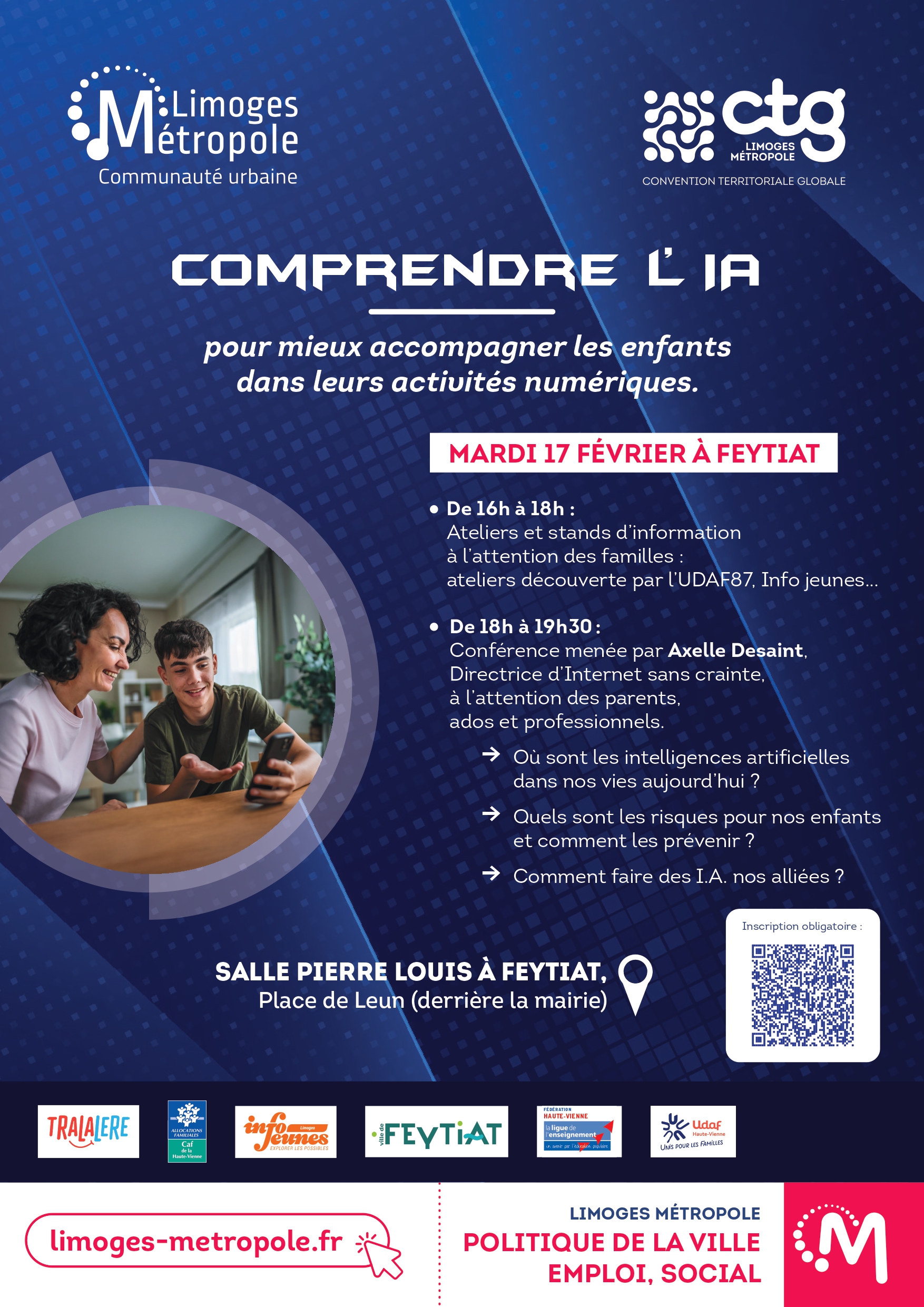 📅 Mardi 17 février 📍 Salle Pierre Louis – Feytiat Comprendre l'IA pour mieux accompagner les enfants dans leurs activités numériques. 🕓 De 16h à 18h Ateliers & stands d’information pour les familles 🕕 De 18h à 19h30 Conférence animée par Axelle Desaint 📝 Inscription obligatoire