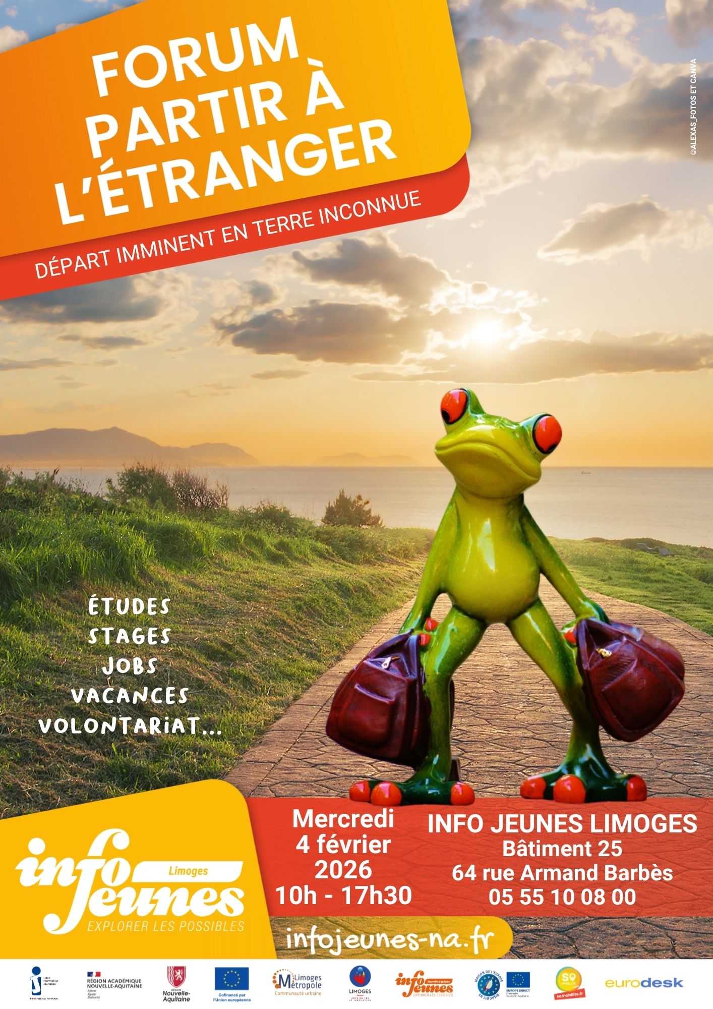 📅 Mercredi 4 février 2026 ⏰ De 10h à 17h30 📍 Tiers-lieu Bâtiment 25 – LIMOGES Cette manifestation est organisée avec le soutien de l’Académie de Limoges, de la Région Nouvelle Aquitaine, de Limoges Métropole et de la Ville de Limoges. À la suite du forum, il sera toujours possible de s’informer sur les opportunités de départ à l’étranger et les structures ressources sur le portail régionalsomobilite.fr (possibilité de prendre un rendez-vous d’information gratuit avec un conseiller en présentiel ou à distance) ou sur infojeunes-na.fr. Tous les détails sur le forum sont disponibles sur le site infojeunes-na.fr et sur la page Instagramd’Info Jeunes Limoges.