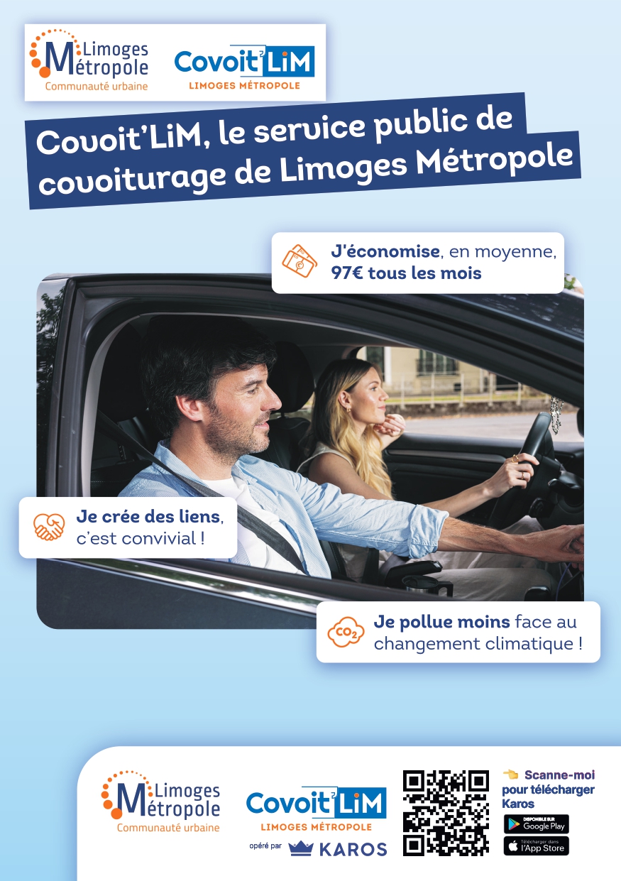 ➡️ Afin d’encourager les usagers, Limoges Métropole propose une nouvelle solution de covoiturage : COVOIT’LiM, un nouveau service en partenariat avec l’opérateur national Karos, pour une durée expérimentale de 8 mois. ➡️COVOIT’LiM est dédié au territoire de Limoges Métropole et permet de mettre en relation des covoitureurs à la recherche d’un trajet ou en proposant un. ➡️Pour profiter de cette solution, il suffit de télécharger l’application Karos, puis de s’inscrire sur le service COVOIT’LiM. ➡️2 € par trajet et par passager seront versés au conducteur (0,50 € versé par le passager et 1,50 € financé par Limoges Métropole). ➡️Toutes les infos et conditions sont disponibles le site internet de Limoges Métropole :