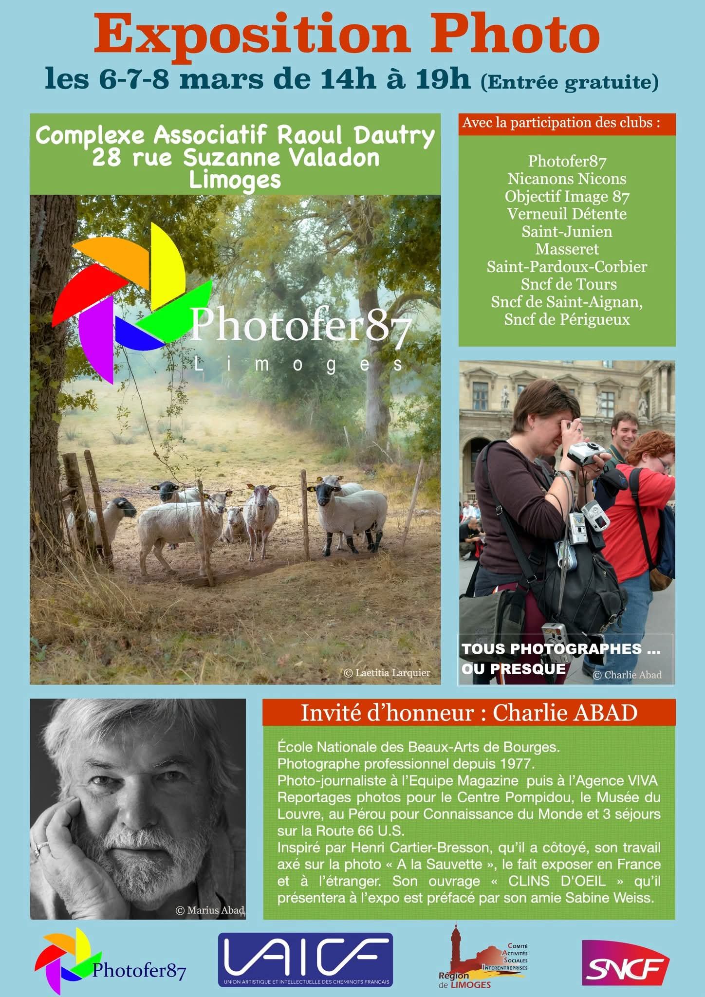 Idée de sortie pour le week-end ! ☁️ Pour la deuxième fois, Photofer87, le Cub Photos de la SNCF invite les photographes de « NICANONS NICONS » (Boisseuil) à participer à leur exposition annuelle. Oubliez le quotidien et laissez-vous surprendre par cette sélection inédite regroupant plusieurs clubs de la région. Vous y découvrirez également le travail de l’invité d’honneur : Charlie ABAD. 📍 Où ? Complexe Associatif Raoul Dautry – 28 rue Suzanne Valadon – 87 LIMOGES. 📅 Quand ? Du 6 au 8 mars 2026. ⏰ Horaires : 14h-19h. ✨ Entrée libre – Venez nombreux partager un moment d'évasion !