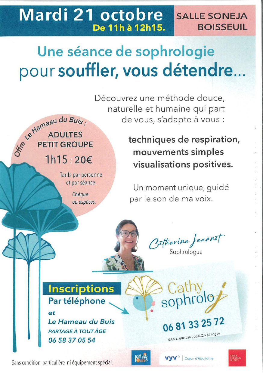 Catherine Jeannot propose une séance de sophrologie. 📅 Le 21 octobre prochain de 11h à 12h15 à la salle Soneja. 📞Inscriptions par téléphone au 06 81 33 25 72
