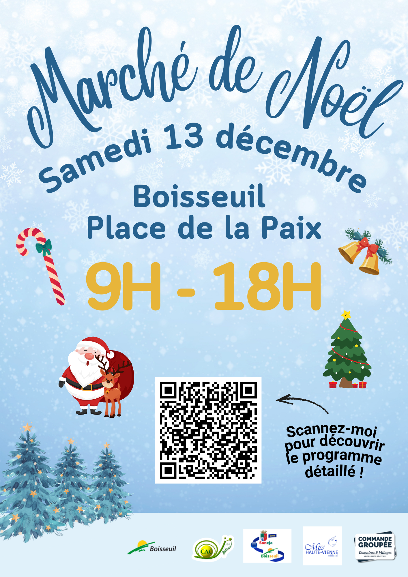 ➡️ Avec la participation de la mairie, le Comité de Jumelage et le CAC de Boisseuil organisent l'incontournable marché de Noël le samedi 13 décembre 2025 place de la paix de 9h à 18h Au programme, 9h : ouverture du marché de Noël 🕯️10h30-12h : ateliers de fabrication de bougies 🍴 12h : restauration sur place 14h30-17h : ateliers fabrication de décorations de Noël avec les aînés dans la salle des mariages 🎶 15h : Chorale poly'songs à l’Ehpad 🎶 16h : Chorale poly’songs à l’église 🎄17h00 : décoration et illumination du sapin de Noël 17h30 à 18h : apéritif de clôture et remise des dons à l'AFM téléthon ✨ Et toute la journée... ✨ Orgue de barbarie, balades à dos d’ânes, calèche, Père Noël, photobooth, actions Téléthon (dont au gymnase : tennis, tennis de table et badminton), food trucks, buvette avec vin chaud, bière, marrons grillés, artisans et créateurs, maquillages, présence du Comité Miss Haute-Vienne 👑