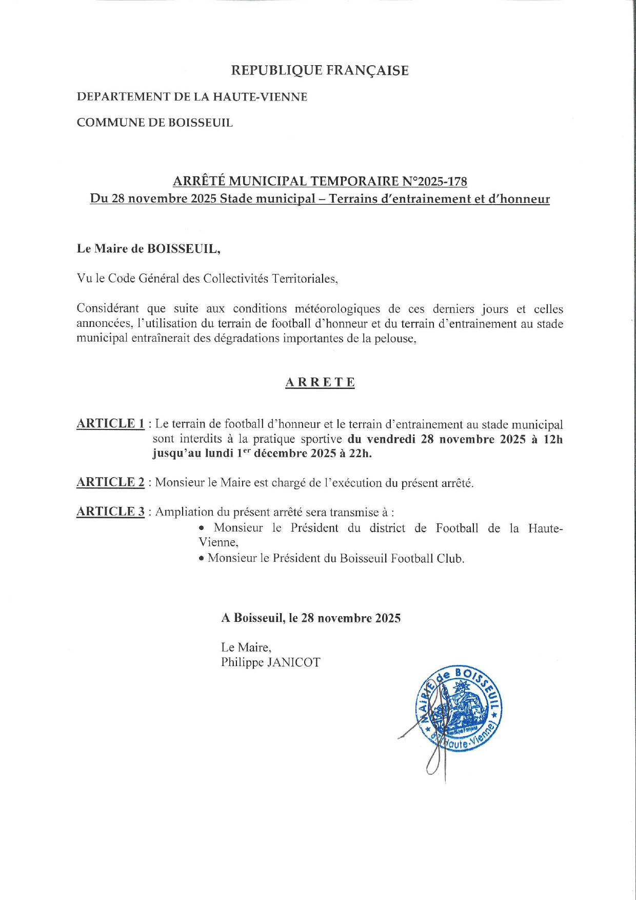 Voici un arrêté en date du 28 novembre 2025 concernant l'utilisation du terrain de football du 28 novembre au 1er décembre 2025 inclus. Merci de votre compréhension.