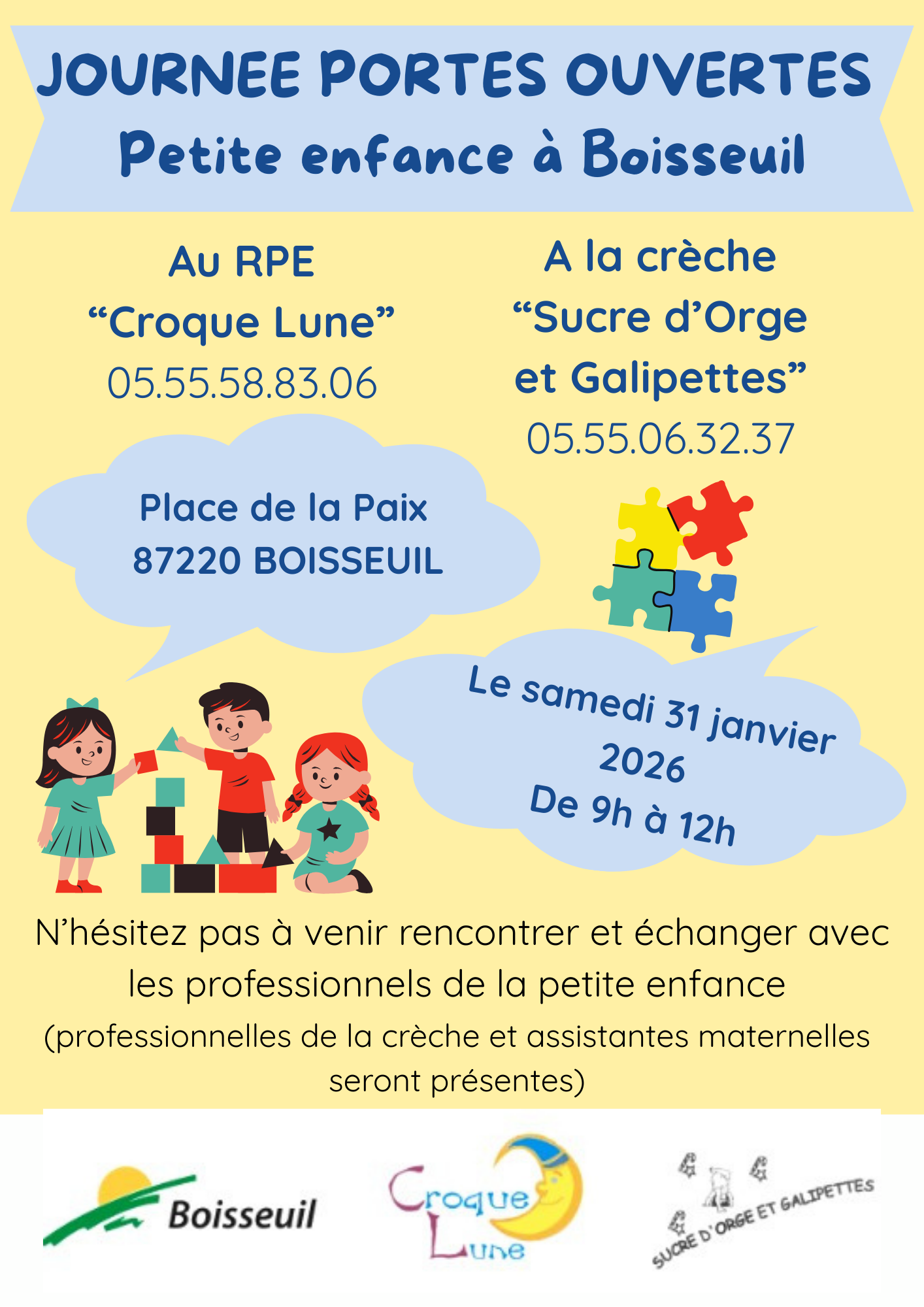 📅Le samedi 31 janvier 2026 🕐9h à 12h 📍 Place de la Paix, 87220 Boisseuil 👉 Venez rencontrer et échanger avec les professionnels de la crèche et des assistantes maternelles. 🤝 Un moment convivial pour poser vos questions, découvrir les services et les modes d’accueil proposés aux familles. 📞 Informations : RPE : 05 55 58 83 06 Crèche : 05 55 06 32 37