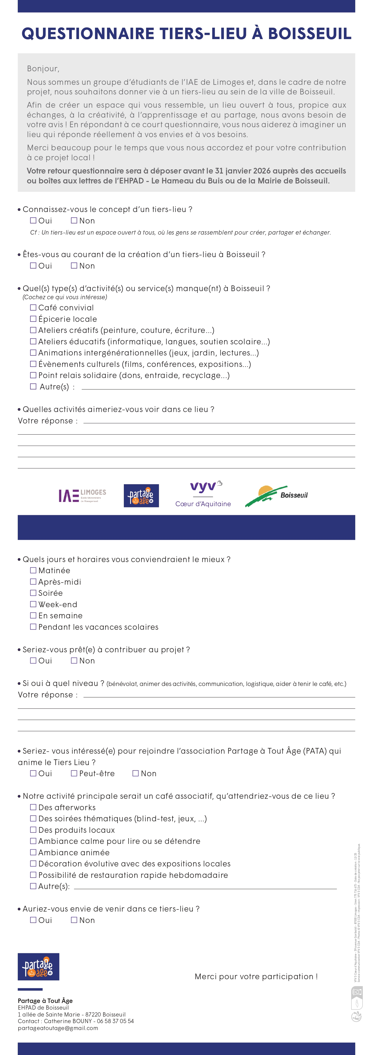 📢 Rappel : questionnaire à retourner ! Les étudiants de l'IAE et les membres de l'association Partage à Tout Âge remercient tous ceux qui ont déjà complété le questionnaire 🙏 Pour les autres, il est encore temps de nous le renvoyer par mail à l'adresse: partageatoutage@gmail.com, ou nous le déposer à l'accueil de la mairie ou l'EHPAD de Boisseuil. Votre participation est précieuse ! 💡 N'hésitez pas à nous communiquer vos coordonnées pour suivre et venir partager ce projet pour TOUS les Boisseuillais!