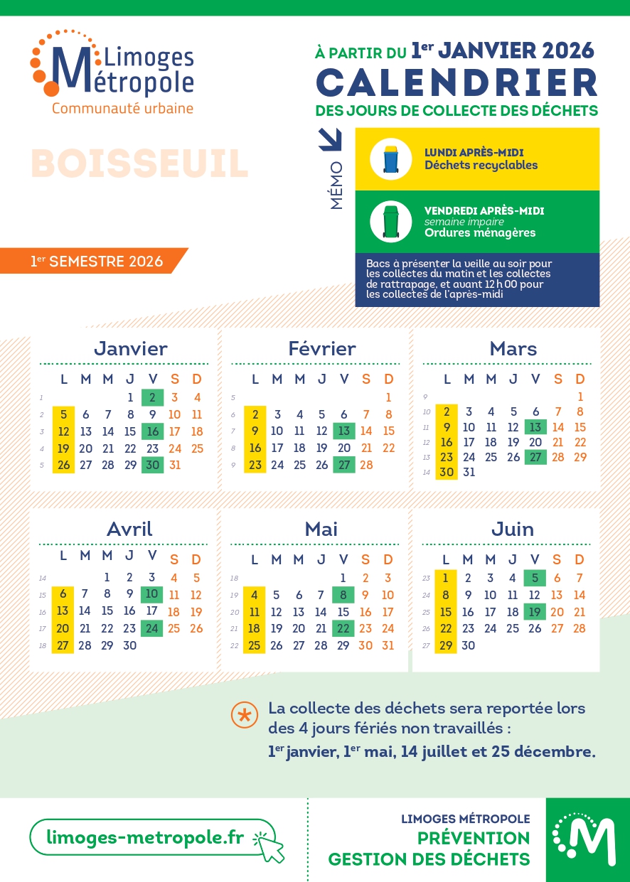 ♻️ Vous trouverez ci-joint le calendrier de collecte des déchets 2026 : urlr.me/2KykDB ➡️ La collecte des encombrants se fera le mardi 19 mai ainsi que le mardi 17 novembre 2026 : urlr.me/6fEApn Retrouvez les informations sur le site de Limoges Métropole :