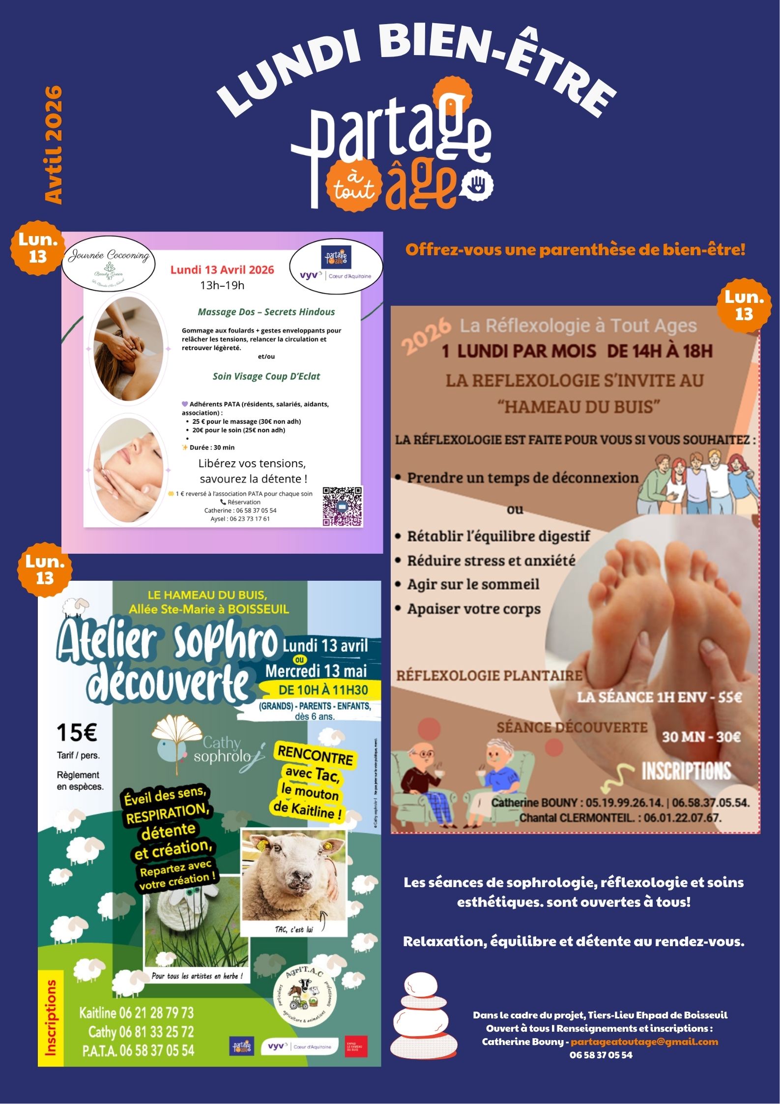 L’association Partage à Tout Âge vous donne rendez-vous pour une nouvelle parenthèse dédiée à votre bien-être. Offrez-vous un moment de détente profonde et durable grâce à l’alliance de l’esthétique, de la sophrologie et de la réflexologie. 🌟 Nouveauté : atelier sophro-créatif Avec la présence exceptionnelle de TAC le mouton 🐑 ! Un atelier spécialement pensé pour les familles, à partager ensemble dans la douceur et la bonne humeur. ✨ Un temps privilégié pour relâcher les tensions, se recentrer et retrouver harmonie et sérénité. 📩 Informations & inscriptions : partageatoutage@gmail.com 📞 06 58 37 05 54