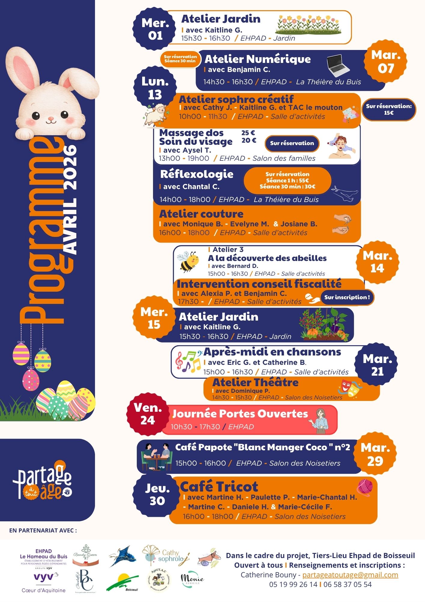Le mois d’avril s’annonce riche en rencontres, en échanges et en moments conviviaux ! Découvrez les temps forts à ne pas manquer 👇 🧘♀️ Lundi 13 avril – Atelier sophro créatif Un moment de détente et de créativité à partager, avec la présence exceptionnelle de TAC le mouton 🐑. 🔹 Mardi 14 avril à 17h30 – Nouvelle intervention : « Conseils Fiscalité » Nous vous proposons une conférence pour mieux comprendre votre impôt et payer juste ce qu’il faut. 👉 Au programme : • Enfants majeurs : rattachement ou détachement du foyer fiscal • Revenus professionnels : abattement de 10% ou frais réels • Plan Épargne Retraite (PER) : optimiser votre déclaration • Réductions et crédits d’impôt : dons, emploi à domicile, garde d’enfants… • Investissement locatif : bien déclarer sans rien oublier Nous aborderons également la gestion du prélèvement à la source et le calendrier fiscal. 🎯 Objectif : repartir avec des repères simples et des conseils personnalisés (avec possibilité de rendez-vous individuel). 🎶 Lundi 21 avril à 15h00 – Après-midi en chanson Un moment musical convivial animé par Eric G et Catherine B. 🍔 Jeudi 24 avril de 10h30 à 17h30 – Journée portes ouvertes Venez découvrir l’EHPAD dans une ambiance festive ! Au programme : foodtruck et divers ateliers aux abords de l’établissement. 🌍 Envie de partir en vacances ? L’association vous accompagne dans votre projet ! Partez en famille, nous vous aidons à concrétiser votre séjour. ✨ Nous vous attendons nombreux pour partager ces moments ensemble !