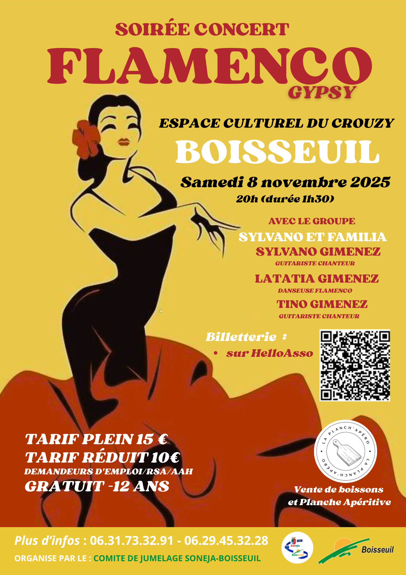Le Comité de Jumelage Soneja-Boisseuil vous invite à une soirée Flamenco ! 📅 Le samedi 8 novembre 2025. 🕐 Début du spectacle 20h00 - Ouverture des portes à 19h00. 📍À l'Espace du Crouzy à Boisseuil. ➡️ Venez vibrer au rythme du Flamenco avec le groupe "Sylvano & Familia", qui vous proposera un spectacle haut en couleur. https://www.facebook.com/share/1HsrHxA8AM/ ➡️ Les inscriptions se feront uniquement par internet sur la plateforme "Helloasso". Inscrivez- vous sur : https://www.helloasso.com/associations/comite-de-jumelage-soneja-boisseuil/evenements/cj-soiree-flamenco-8-novembre-2025 Planches apéro et boissons seront disponibles à la vente pour accompagner votre soirée dans une ambiance conviviale. Venez nombreux pour partager ce moment festif !