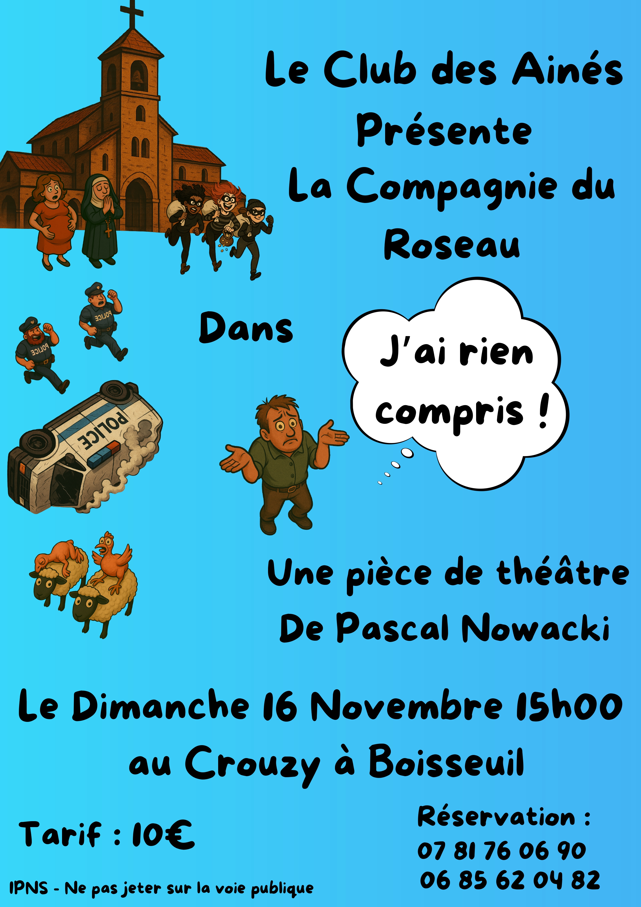 Le Club des Ainés présente la Compagnie du Roseau dans la pièce de théâtre "J'ai rien compris !" L’action se passe dans le bureau de la mère supérieure d’une congrégation religieuse. Prenez trois fugitives, ajoutez quelques religieuses névrosées, une américaine enceinte et sans papiers, un inspecteur de police proche de la retraite et son jeune collègue aussi fougueux qu’incompétent. Saupoudrez d’un zeste d’agriculteur converti aux cultures « parallèles ». Mélangez le tout et finissez par un homme à tout faire pas très malin. Voilà la recette d’un cocktail explosif de bonne humeur et franches rigolades. 🎭 Plus d'informations sur l'affiche jointe.