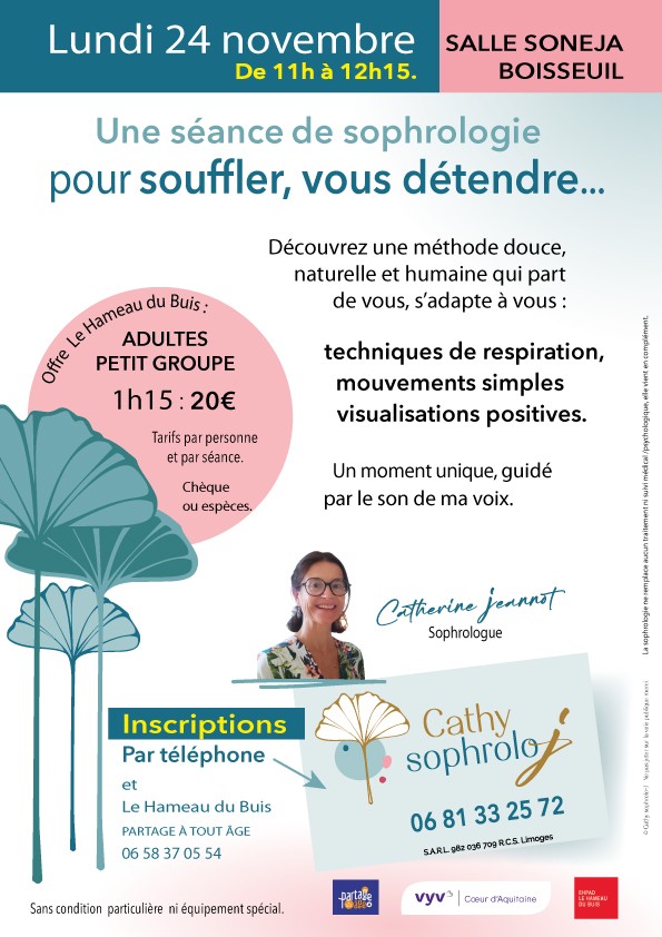 Catherine Jeannot propose une séance de sophrologie. 📅 Le lundi 24 novembre prochain de 11h à 12h15 à la salle Soneja. 📞Inscriptions par téléphone au 06 81 33 25 72