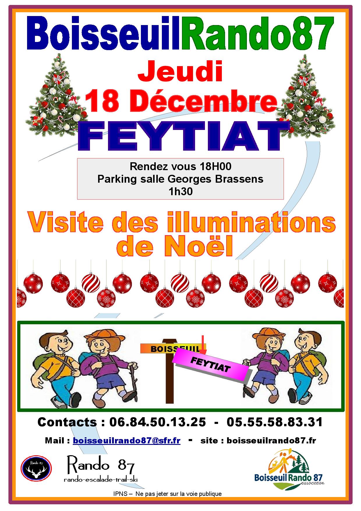LE CLUB DE RANDO "BOISSEUIL RANDO 87 " VOUS INVITE JEUDI 18 DECEMBRE 18H AU PARKING DE LA SALLE GEORGES BRASSENS A FEYTIAT POUR UNE RANDONNEE D'ENVIRON 1H30 POUR DECOUVRIR LES ILLUMINATIONS DE NOEL DE FEYTIAT. A VOS CHAUSSURES ET A JEUDI. BOISSEUIL RANDO 87