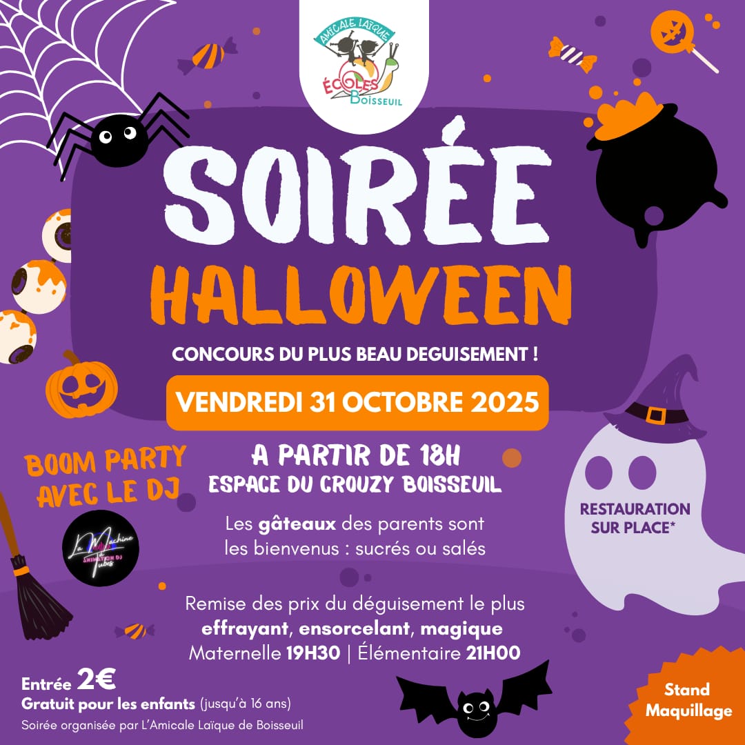 Petits monstres, sorcières, vampires et citrouilles enchantées… sortez vos déguisements les plus effrayants ! 🧙♀️🕸️ L’Amicale Laïque vous invite à une grande soirée d’Halloween pleine de musique, de rires et de frissons ! Au programme : 💃 Boom d’Halloween animée par notre DJ 🎧 La Machine a TUBES 🎨 Stand maquillage pour se transformer en créature fantastique 🏆 Concours du plus beau déguisement (19h30 pour les maternels, 20h30 pour les élémentaires) 🍪 Vente de gâteaux et de douceurs 💰 Entrée : 2 € 👧🧒 Gratuit pour les enfants jusqu’à 16 ans 🧡 Venez nombreux pour partager un moment festif et terriblement convivial ! N’oubliez pas vos costumes, vos gâteaux… et votre plus beau rire de sorcière ! 😈