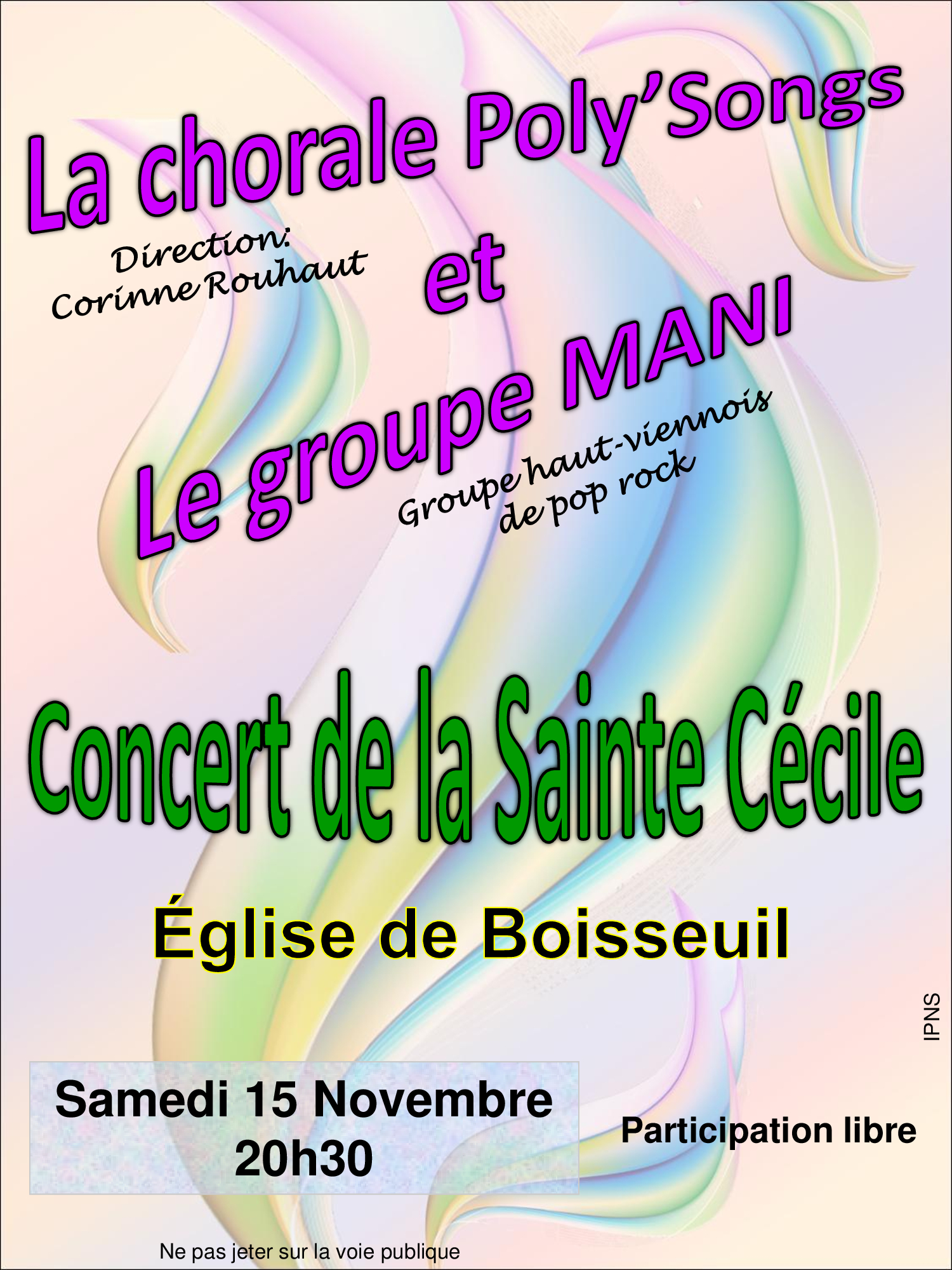 La chorale Poly'Songs organise son concert traditionnel de la Sainte Cécile le samedi 15 novembre (20h30) à l'église de Boisseuil. Elle sera accompagnée par MANI, un groupe de pop rock haut-viennois qui vous emmènera dans son univers empli d'énergie positive.