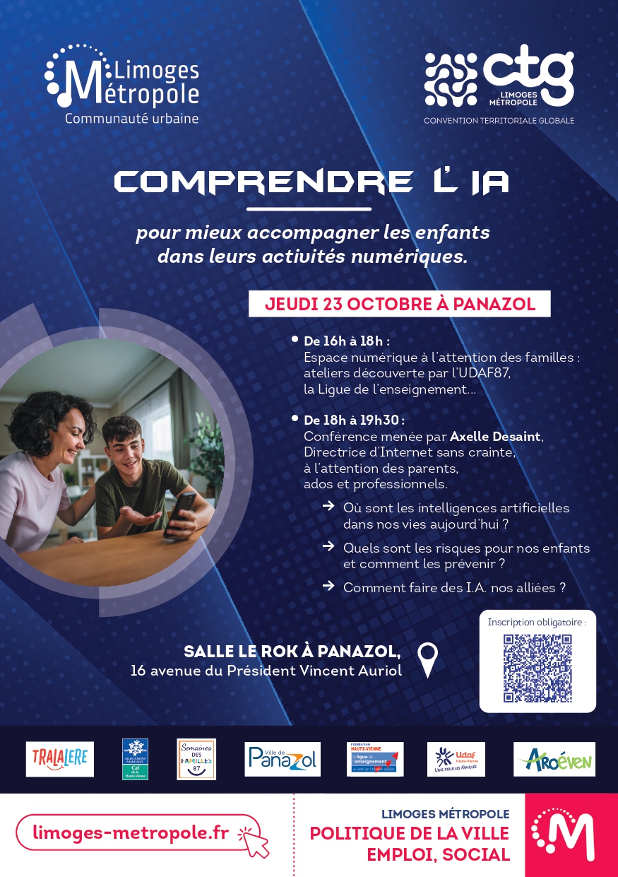Organisé par Limoges Métropole, dans le cadre des Semaines des familles de la Caisse d’Allocations familiale (CAF), un temps d’échange dédié à l’IA et la parentalité se déroulera le jeudi 23 octobre après-midi au Rok à Panazol, avec pour objectif de mieux accompagner les enfants dans leur activité numérique. Programme : De 16 h à 18 h, un espace numérique réunira plusieurs associations et représentants des communes de Limoges Métropole, pour animer des ateliers ludiques liés aux nouvelles technologies, à l’attention des familles. De 18 h à 19 h 30, la directrice du projet « Internet Sans Crainte », Axelle Desaint, animera une conférence sur l'usage de l’IA dans le quotidien des enfants et dans le cadre scolaire à l'attention des parents, adolescents et professionnels. Inscription obligatoire :