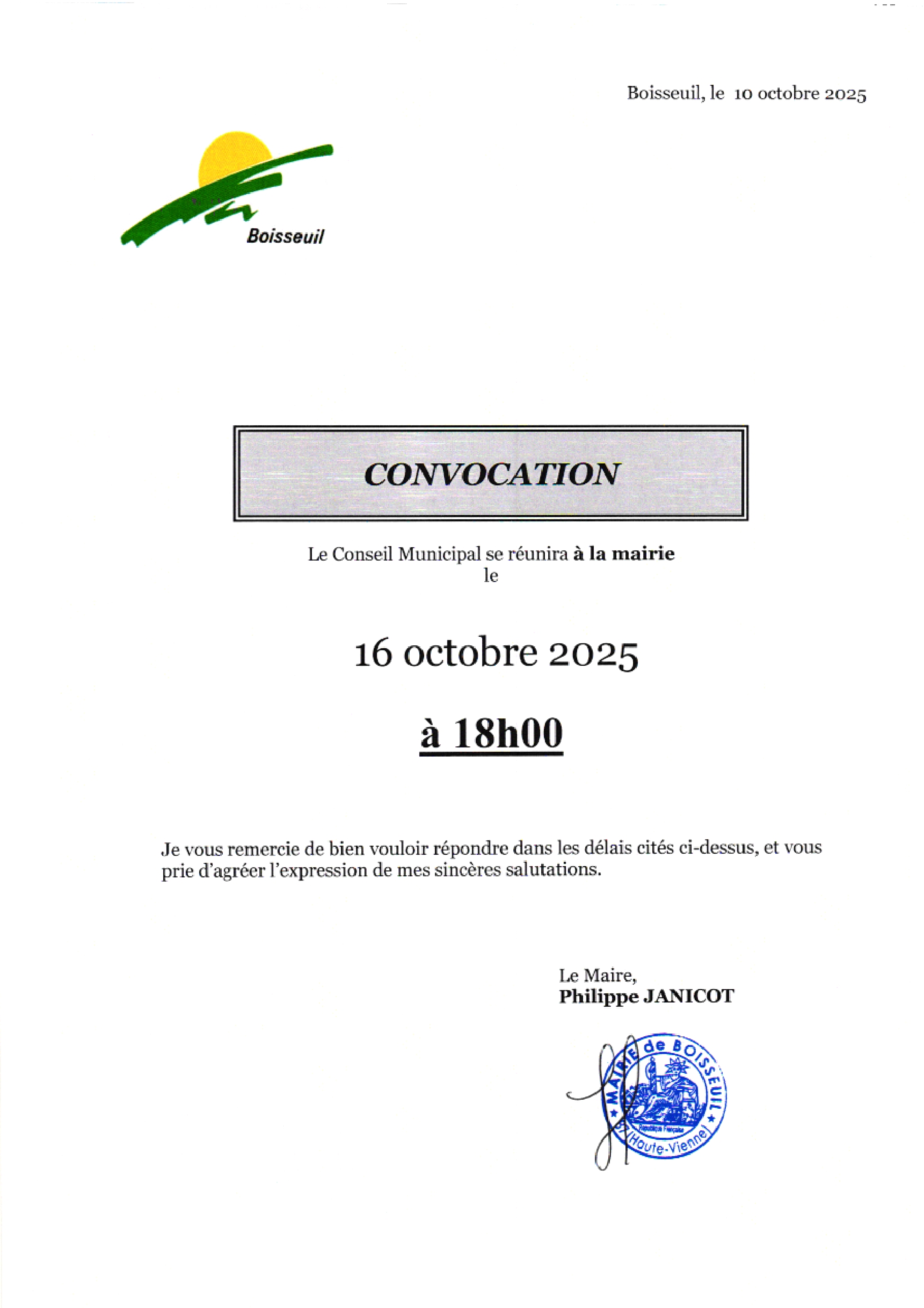 Le Conseil Municipal se réunira à la mairie le 16 octobre 2025 à 18h.