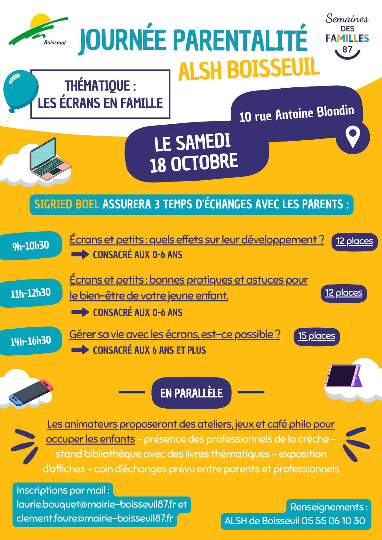 📢 Plus que 8 jours pour vous inscrire aux 3 conférences prévues samedi 18 octobre lors de la première édition « Journée pour la famille » à Boisseuil. 👉 Cet évènement est entièrement gratuit et pensé pour vous apporter réponses et solutions. 💻 Cette année le thème est « Les écrans en famille » ! 💻 ➡️ Les animateurs proposeront des ateliers, jeux et café philo pour occuper les enfants 🧑💼Présence des professionnels de la crèche 📚 Stand bibliothèque avec des livres thématiques 🪧 Exposition d'affiches 💬 Coin échanges prévu entre parents et professionnels ‼️Inscriptions obligatoires par mail : laurie.bouquet@mairie-boisseuil87.fr et clement.faure@mairie-boisseuil87.fr