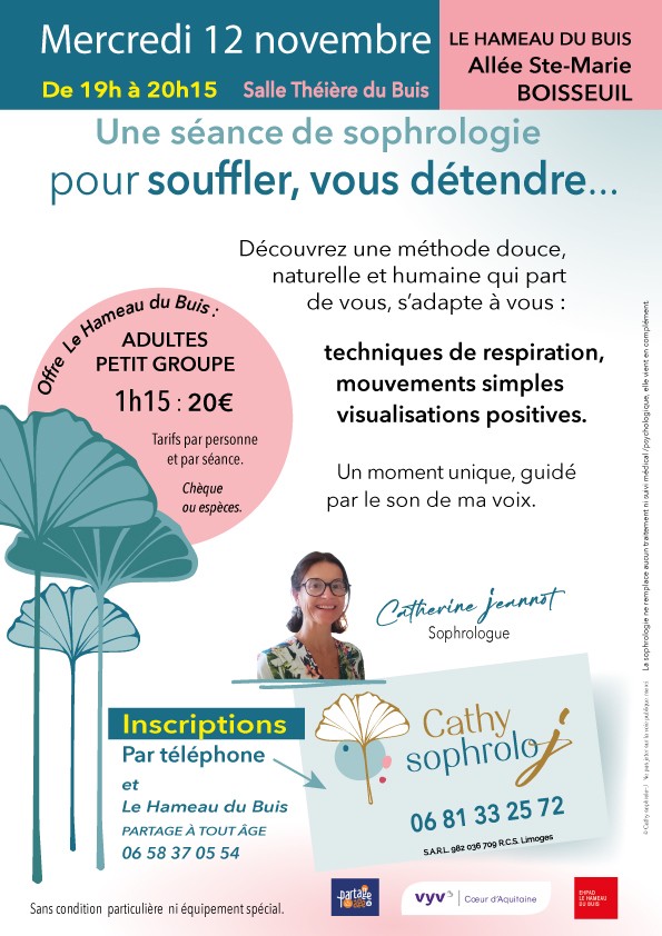 Catherine Jeannot propose une séance de sophrologie. 📅 Le mercredi 12 novembre prochain de 19h à 20h15 à l'EHPAD Le Hameau du Buis, 1 Allée de Sainte-Marie, 87220 Boisseuil Salle Théière du Buis 📞Inscriptions par téléphone au 06 81 33 25 72