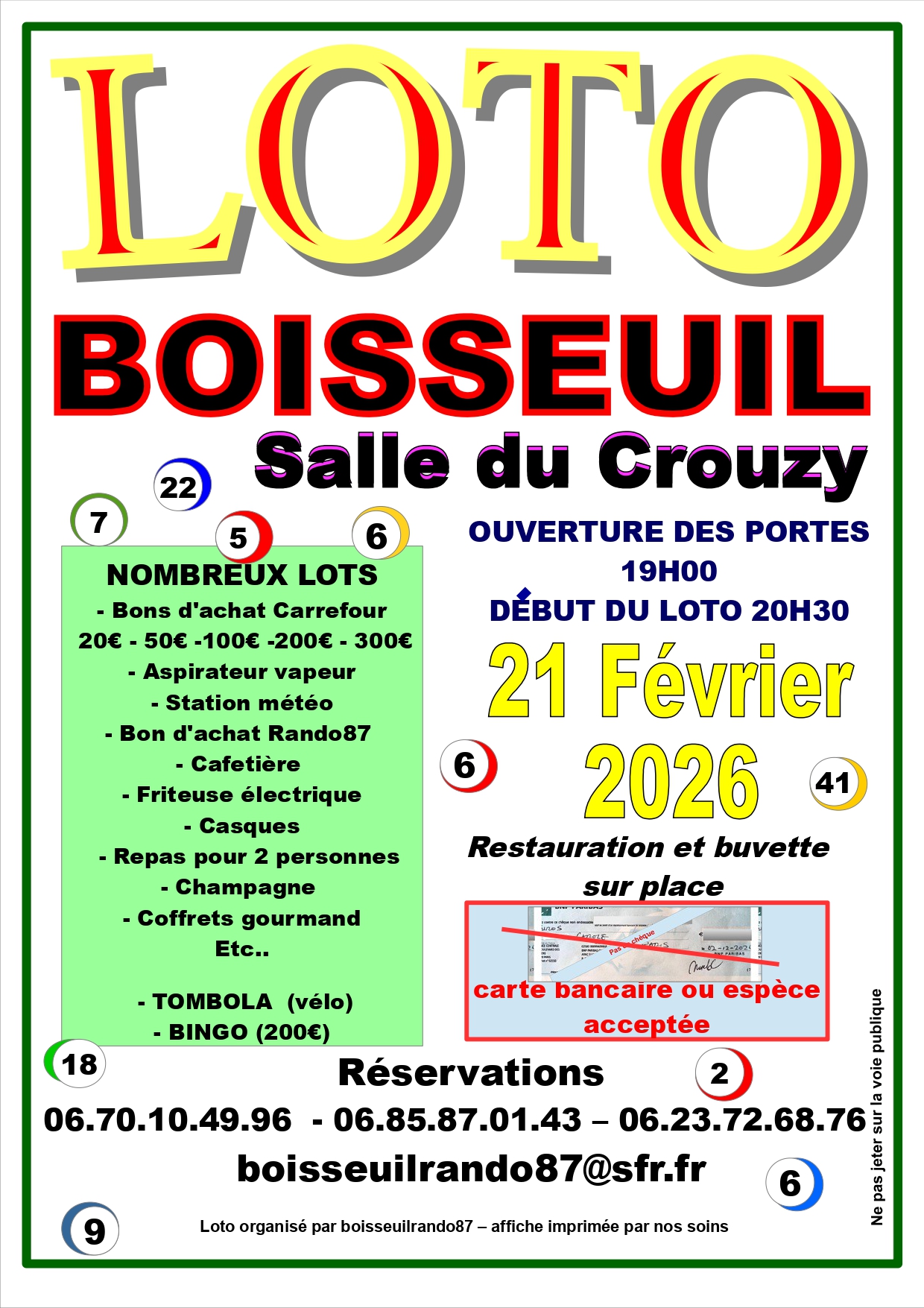 LOTO BOISSEUIL L'association Boisseuil Rando87 vous attend le Samedi 21 Février à 19h à l'espace Crouzy pour son Loto. Pensez à réserver!!! De nombreux lots à gagner. Moyens de paiements acceptés uniquement espèces et carte bancaire. Pour un moment de convivialité et d'amusement pour petits et grands. A très vite l'association Boisseuil Rando87